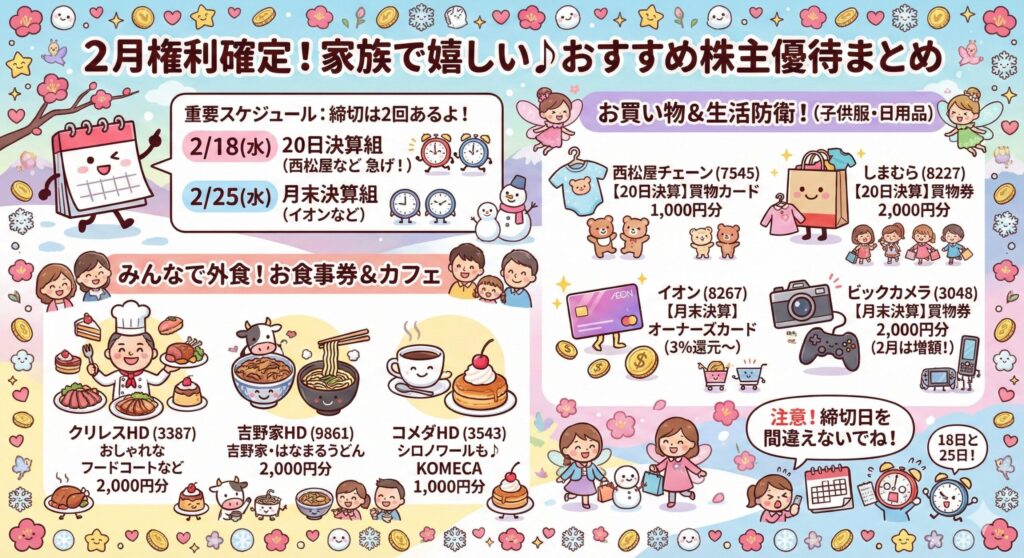 さて、投資家の皆さんにとって2月は「隠れた優待祭り」の月です。 3月決算が注目されがちですが、実は**「外食・小売り」**など、パパママにとって生活の支えになる優待が2月には集中しているんです。