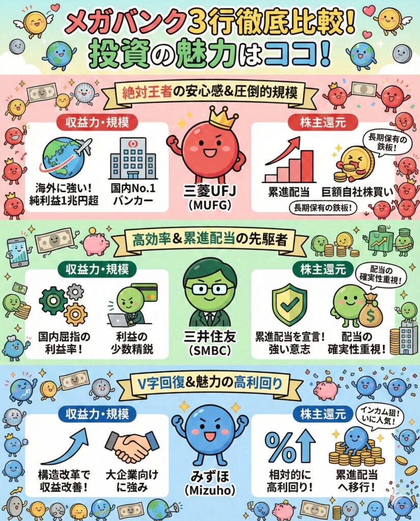 「新NISAで何を買えばいいか分からない」「ほったらかしで配当金が増えていく銘柄が欲しい」 そんな悩みを持つ投資家にとって、今最も頼りになるのが日本の**「メガバンク3行」**です。