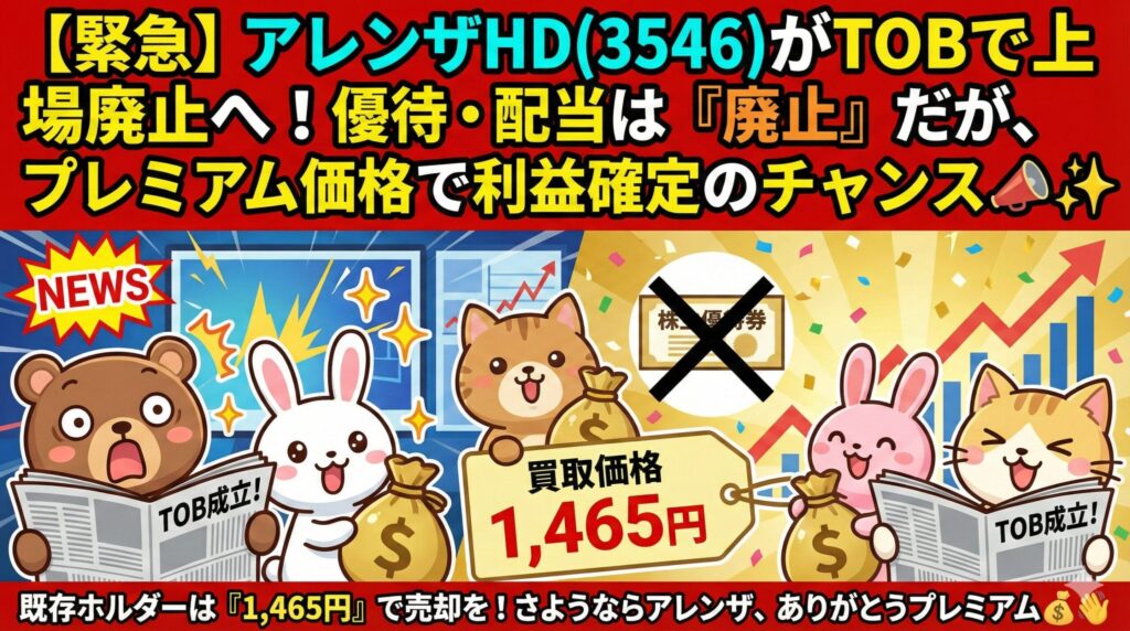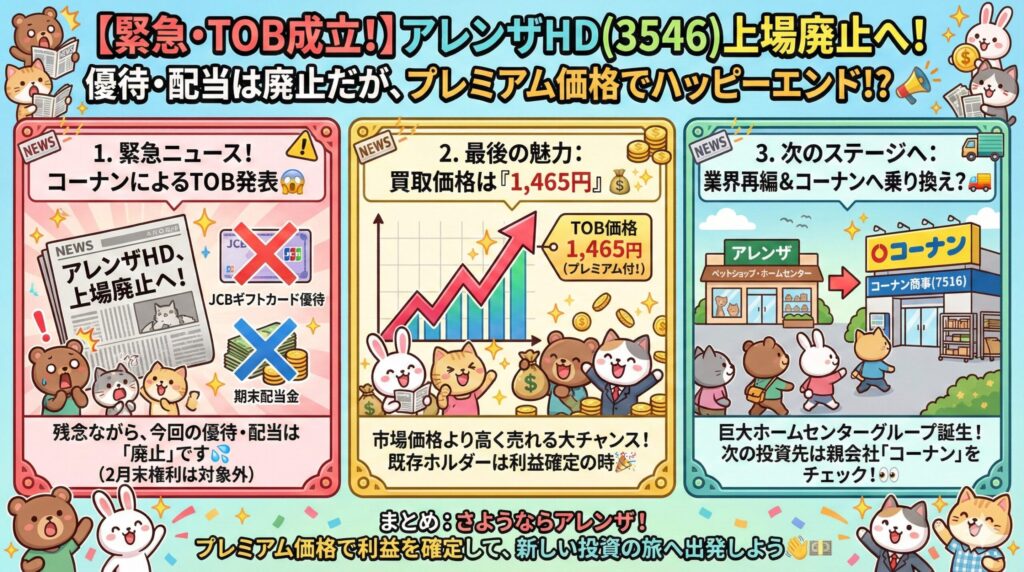 「ダイユーエイト」やペットショップ「アミーゴ」でおなじみのアレンザホールディングス。 2月権利確定の隠れた名優待株として紹介する予定でしたが、なんと**コーナン商事(7516)に買収されることが決まりました。 これにより、楽しみにしていた株主優待と配当金は、残念ながら「廃止」**となります。 今、投資家はどうすべきか? 緊急解説します。