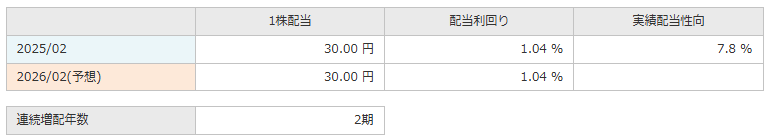 | 優待権利確定月 | 2月8月 | 配当利回り(予想) | 1.04% |
