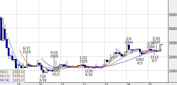 2020年を底に上昇反転となっていますが、上場来高値には届かず