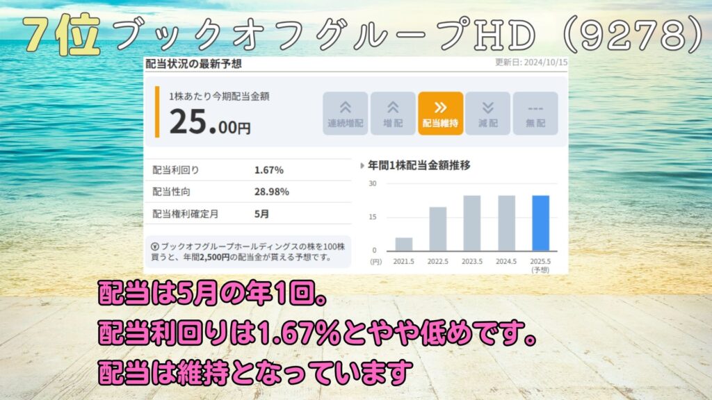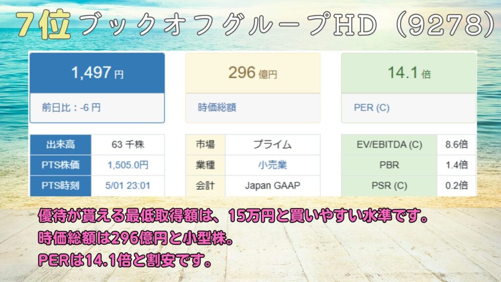 株主優待の内容は、5月の年1回、ブックオフのほか、グループ店舗で使える優待買物割引券が貰えます。