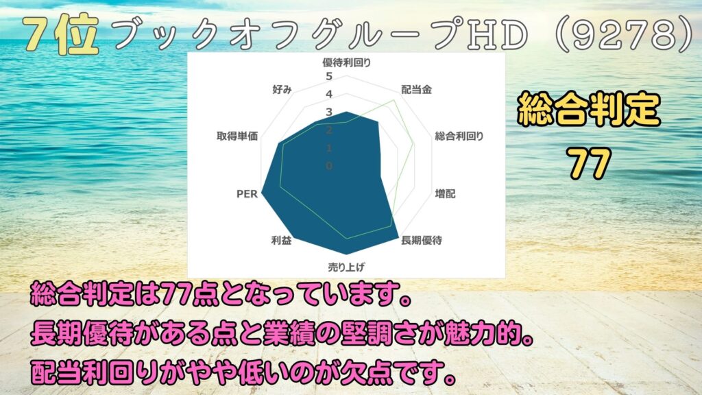 長期優待がある点と業績の堅調さが魅力的。配当利回りがやや低いのが欠点です。