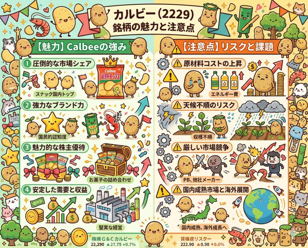 - 気象リスク: じゃがいもは農産物です。過去には北海道の台風被害で「ポテチショック(品薄・休止)」が起きたことも。原材料の調達が天候に左右されやすい点は、食品メーカー特有のリスクです。
