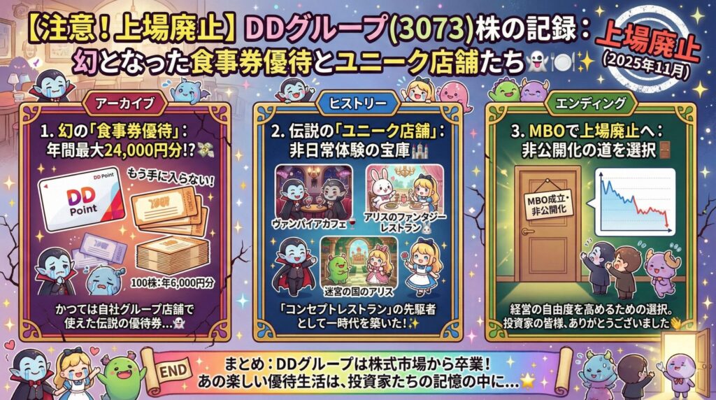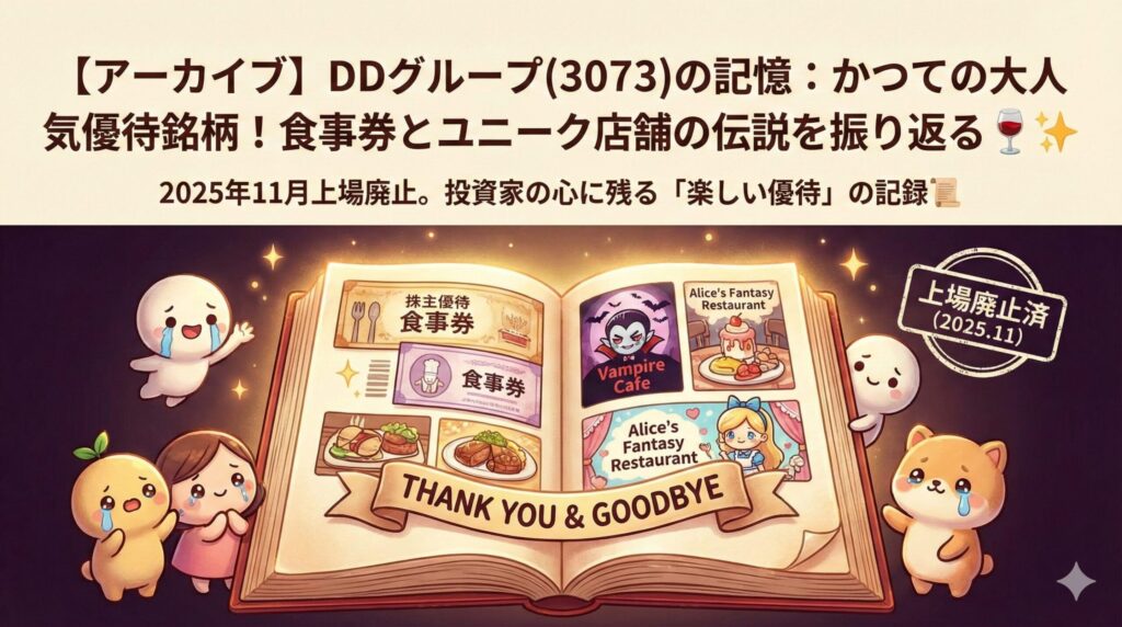 「Vampire Cafe」などのユニークな店舗で人気だったDDグループ。 2月の優待銘柄として狙っていた方も多いかもしれませんが、残念ながら昨年上場廃止となり、もう手に入れることはできません。 しかし、嘆く必要はありません。私たちには**「クリエイト・レストランツ・ホールディングス(3387)」**(通称:クリレス)があります。 熊本県民、特に子育て世帯にとっては、むしろこちらの方が「正解」かもしれません。その理由を徹底解説します。