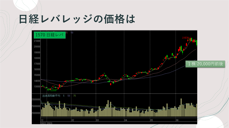 日経レバは13020から20255円と1.56倍で指数と比べて2倍以上の上昇率となっています。