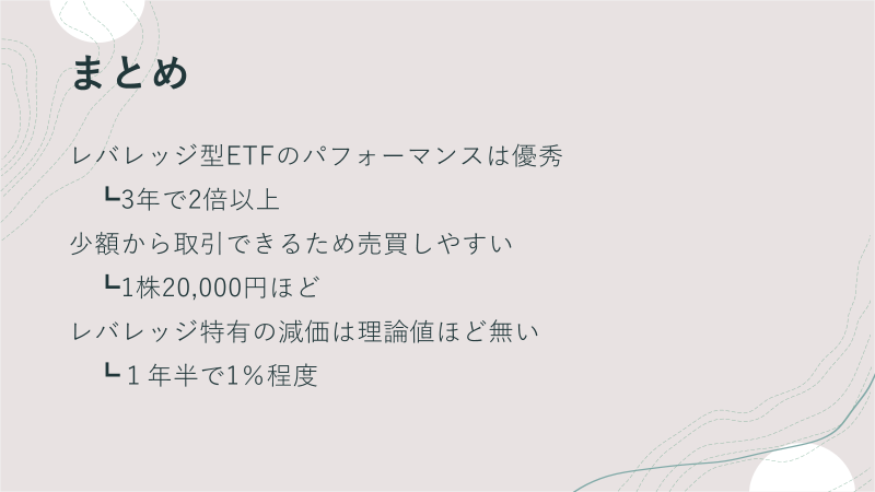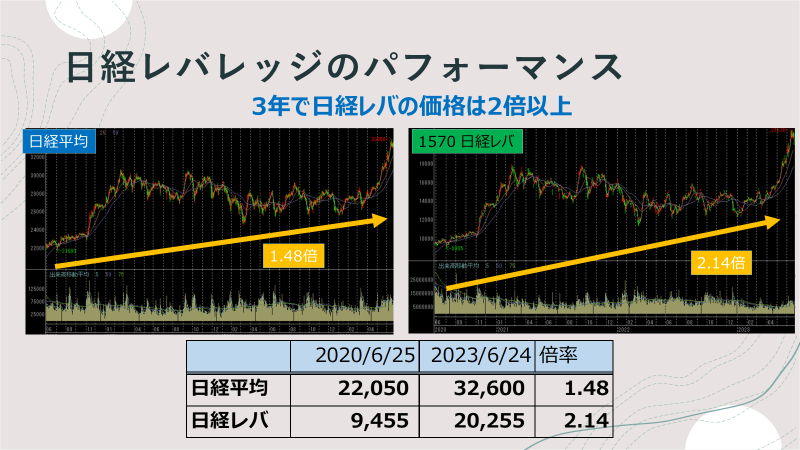 レバレッジ型ETFのパフォーマンスは優秀で直近3年では2倍以上。
