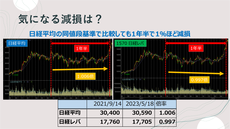 レバレッジ特有の減損は理論値ほどではなく1年半で1%程度です。