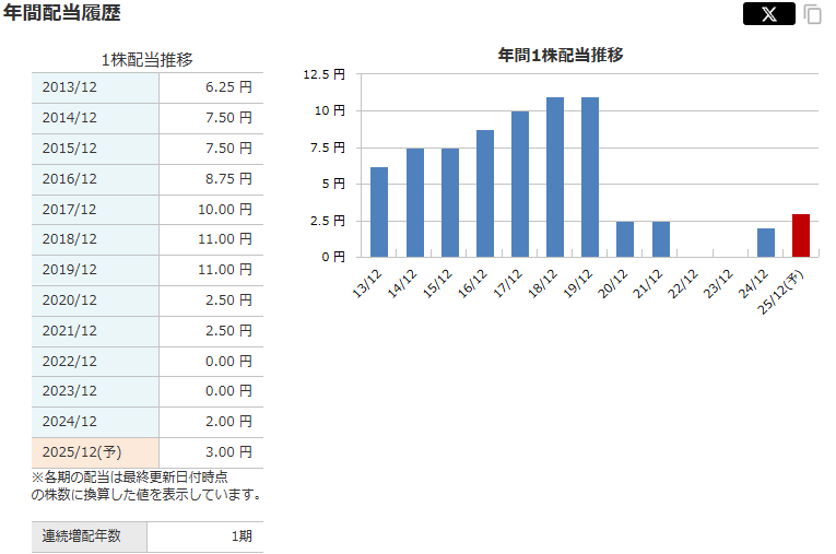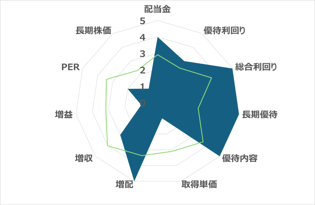 | 優待投資評価 | ★★★☆☆69pt | 1株配当(予想) | 3円 |