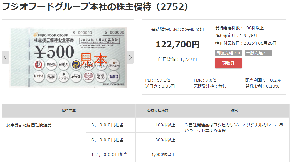 | 優待の最低取得額 | 122,700円 | 総合利回り(予想) | 5.13% |