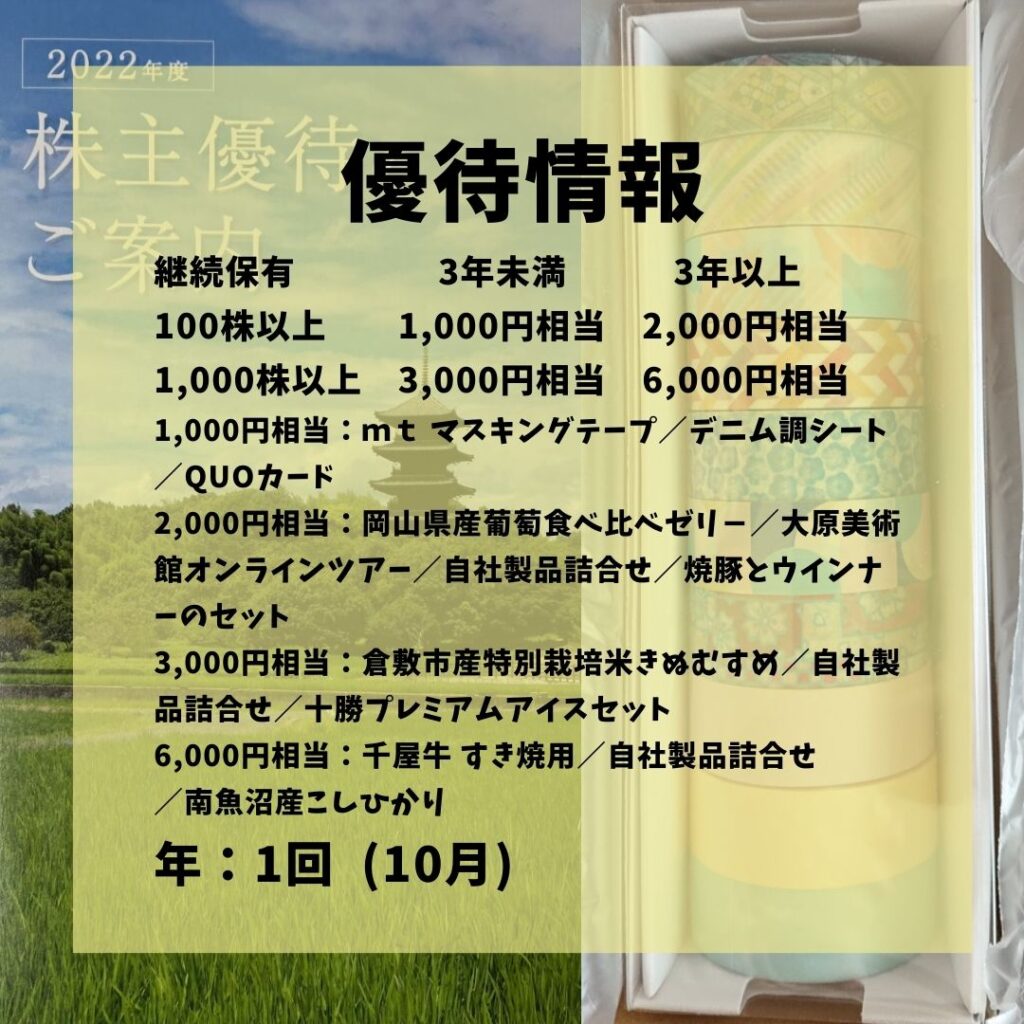 | 優待回数 | 1回/年 | 配当利回り(予想) | 3.42% |
