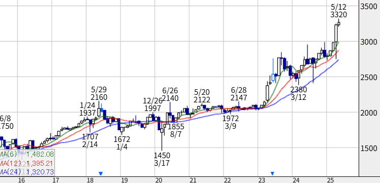 利益も上がってはいるが、株価も上昇しているので割安性は変わらない状況。
