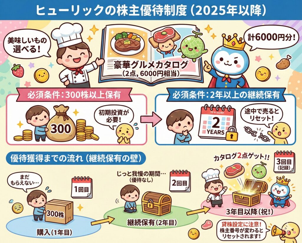 ヒューリックの最大の魅力といえば、なんといっても**「3,000円相当のグルメカタログギフト」です。しかし、ここで最も注意しなければならないのが、2025年から完全実施された「継続保有期間」の条件変更**です。