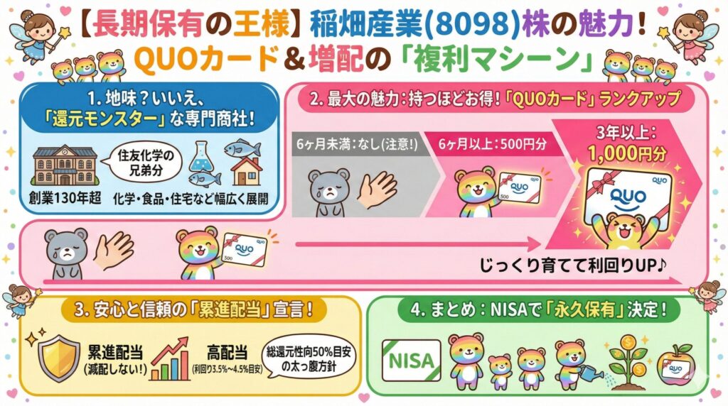 稲畑産業は、短期で儲ける銘柄ではありません。「3年後にQUOカードが倍になるのを楽しみに待つ」という、時間の経過そのものを価値に変える投資ができる銘柄です。 お子さんの成長と共に、この株も育ててみてはいかがでしょうか。