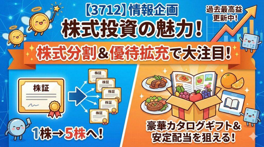 情報企画の株主優待は、投資家から人気の高い**「図書カード」や「産直品カタログギフト」です。 さらに、2026年2月の発表により、同年4月1日を効力発生日とする「1株→5株の株式分割」とそれに伴う「優待制度の実質拡充」**が行われることになりました!