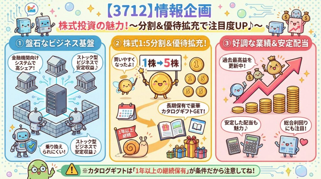 「手堅く稼いでいるBtoB企業に投資したい」「豪華なカタログギフト優待が欲しい!」という方にぴったりなのが、**情報企画(3712)**です。