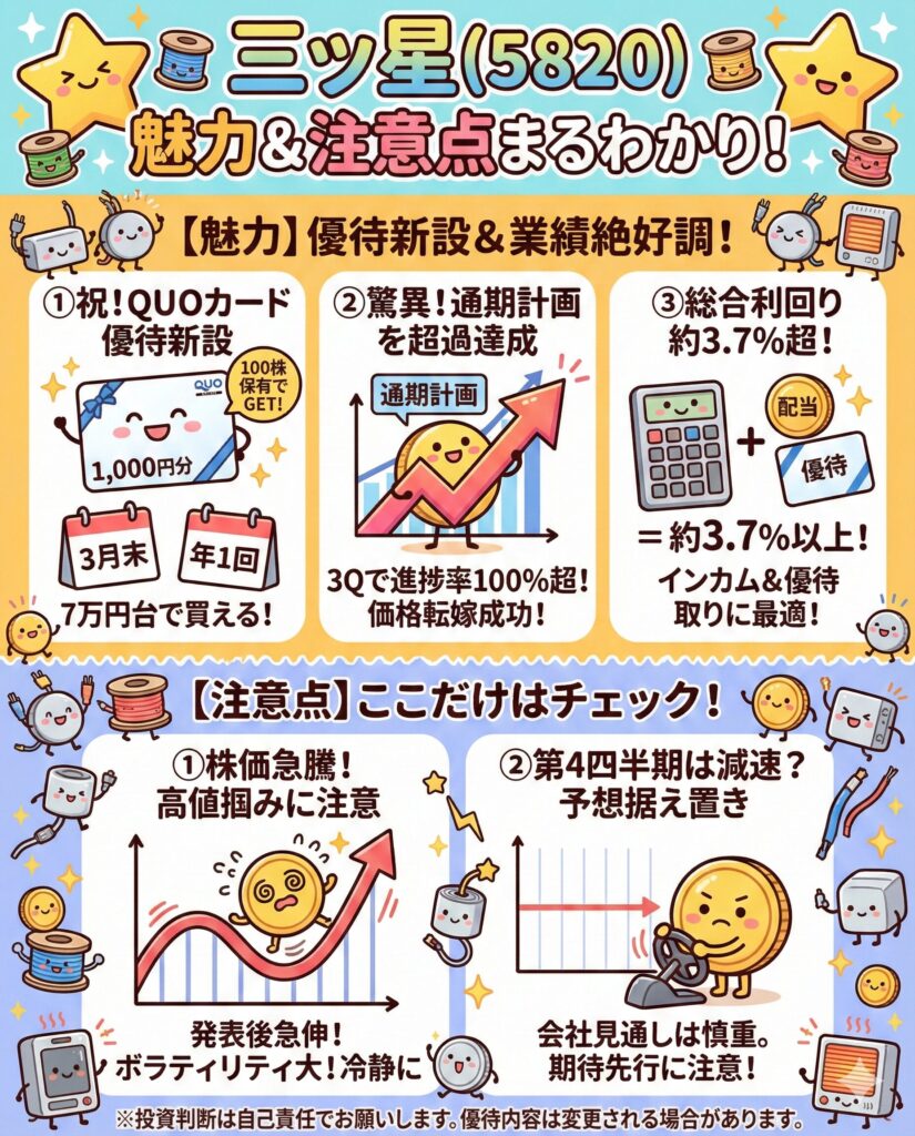 電線や配管用ヒーターなどの製造を手掛けるスタンダード市場上場のメーカー「三ッ星(5820)」。 地味ながらも堅実な経営を続ける同社ですが、2026年2月13日、ついに個人投資家が待ち望んでいた**「株主優待制度の導入」**を発表し、SNSや株主優待ブログで大きな話題となっています!