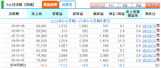 店舗数微増(前期2店純減)。既存店はスマホ販売順調。省エネ買い替え補助金追い風に白物家電が期初想定超。粗利率上昇。人件費こなし前号比営業増益幅拡大。26年8月期はエアコンが高水準維持。