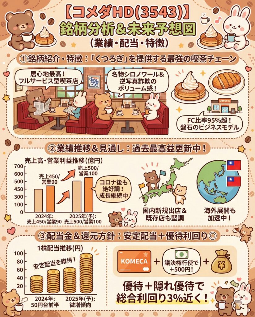 メニュー写真より実物の方が大きい「逆写真詐欺」で度々バズるコメダ珈琲店。 そのサービス精神は、株主還元においてもしっかり発揮されています。 株価は少し高め(約2,900円前後)ですが、その分、安定感と満足度は抜群です。