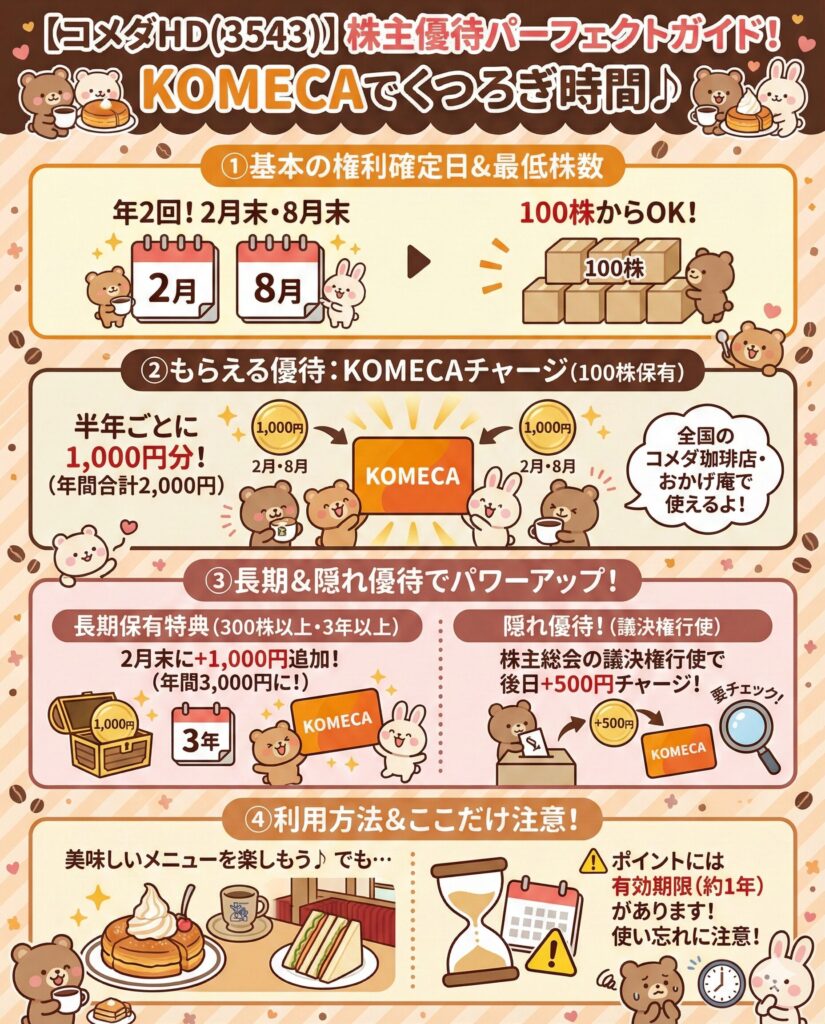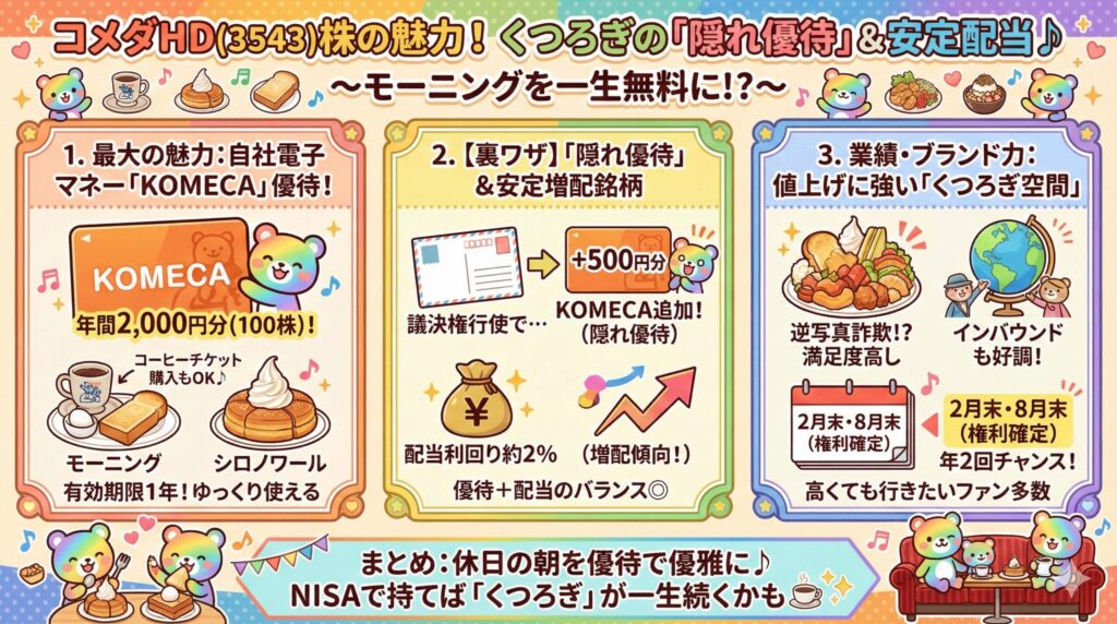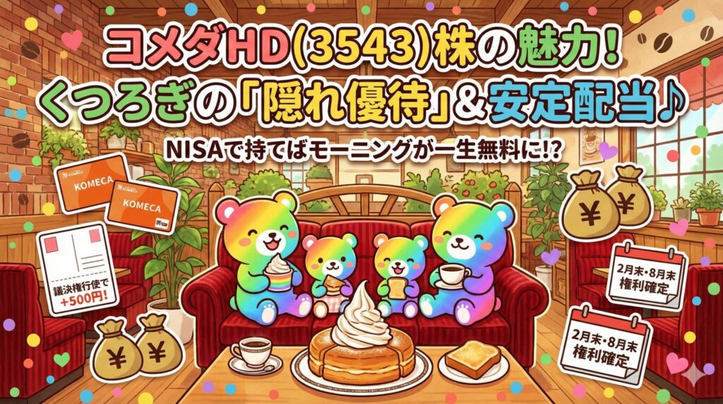 週末、家族みんなでコメダに行って、モーニングとシロノワールを囲む。 お会計は株主優待カードで「ピッ」と済ませる。 そんな**「ちょっと豊かな休日」**を約束してくれるのが、コメダ株を持つ最大のメリットです。