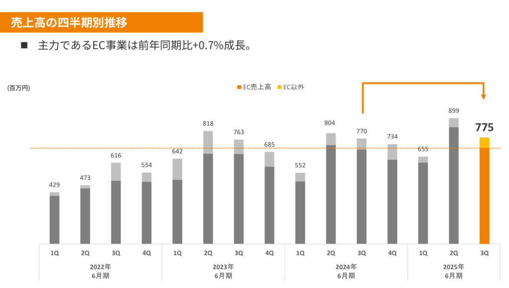 EC会員数が着実に増加。メーカー・卸の在庫不足は前半で解消、仕入れ可能な量増えて販売伸長。送料・倉庫代削減で粗利改善。広告宣伝費を効率化。営業黒字浮上。税効果が純益押し上げ。25年6月期は販売数量が順調に拡大。利益続伸。