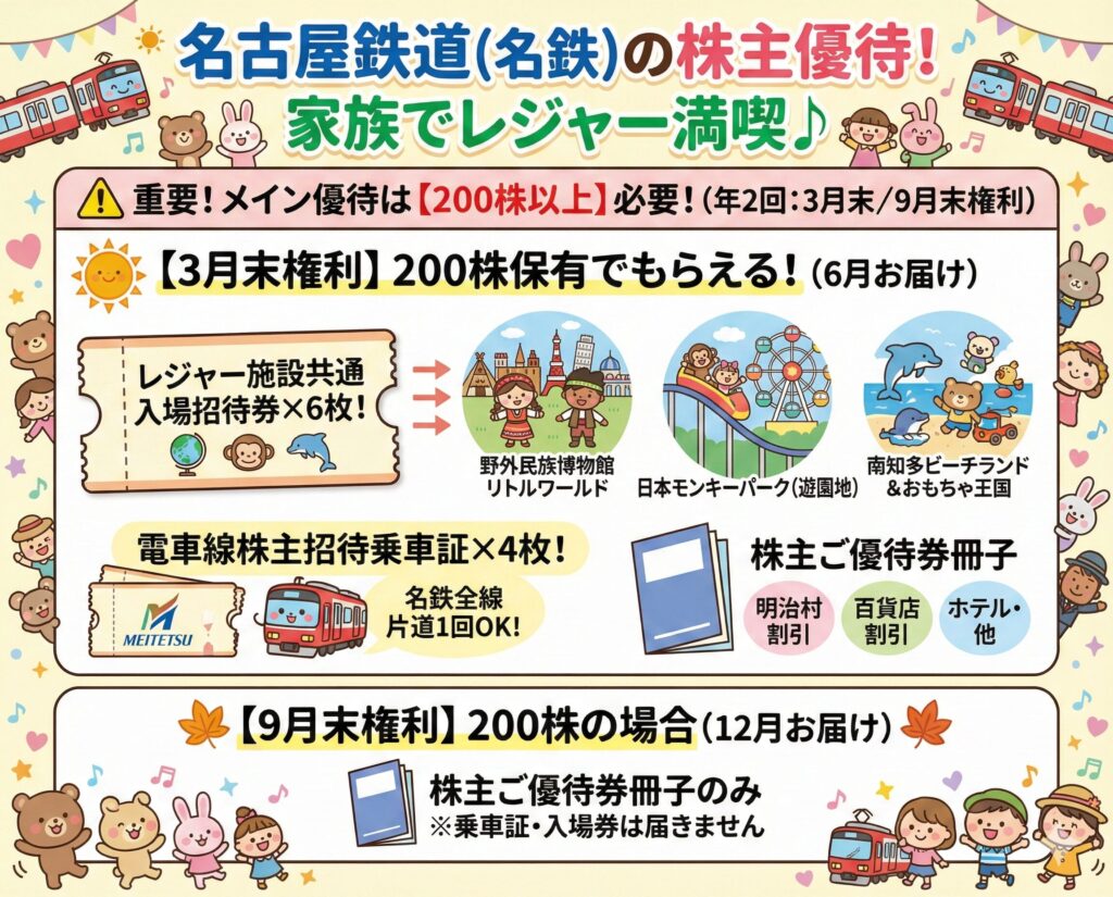 まずは、基本情報からおさらいしましょう。名鉄の株主優待は、自社路線の乗車券や、グループが運営するレジャー施設の入場券がたっぷりもらえる、非常に豪華な内容です。