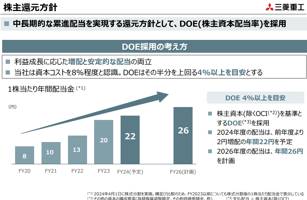 株主資本配当率(DOE)4%以上を目安とし、配当を増額・維持する累進配当の実現を目指す