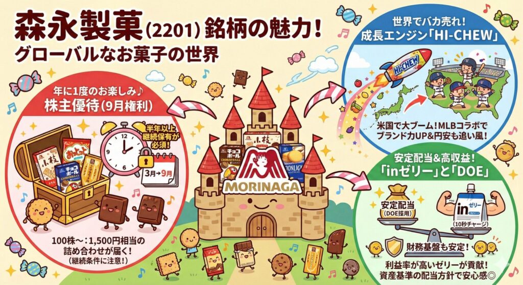 昔ながらの駄菓子屋さんのイメージから、世界の「MORINAGA」へ。 株価の成長とお菓子の到着を楽しみに、ポートフォリオに加えてみてはいかがでしょうか?