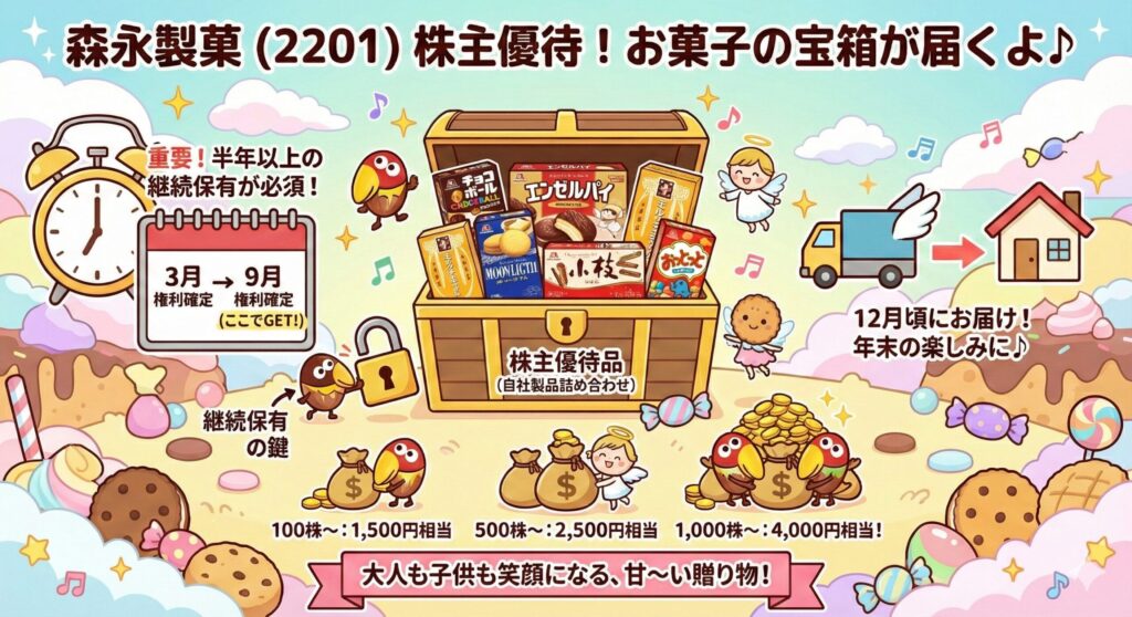 ここで一つ、最大の注意点があります。森永製菓の優待には**「継続保有期間 半年以上」**という条件があります。