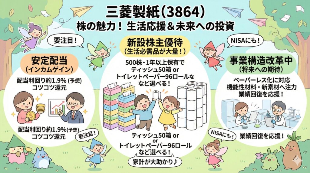 総括すると、三菱製紙は**「大ボリュームの日用品優待は非常に魅力的だが、本業の業績立て直しには課題が残る銘柄」**と言えます。すぐに株価の大きな上昇を狙うというよりは、余剰資金を使って生活必需品を確保しつつ、気長に企業の構造改革と業績回復を応援できる方に向いている銘柄です。