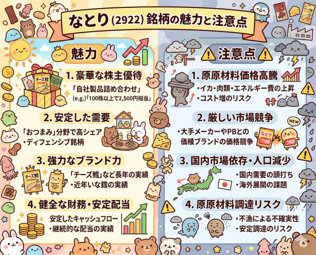 なとり(2922)は、「リスクを抑えつつ、実益(おつまみ)を楽しみながら長期保有したい」 という方に最適な銘柄です。