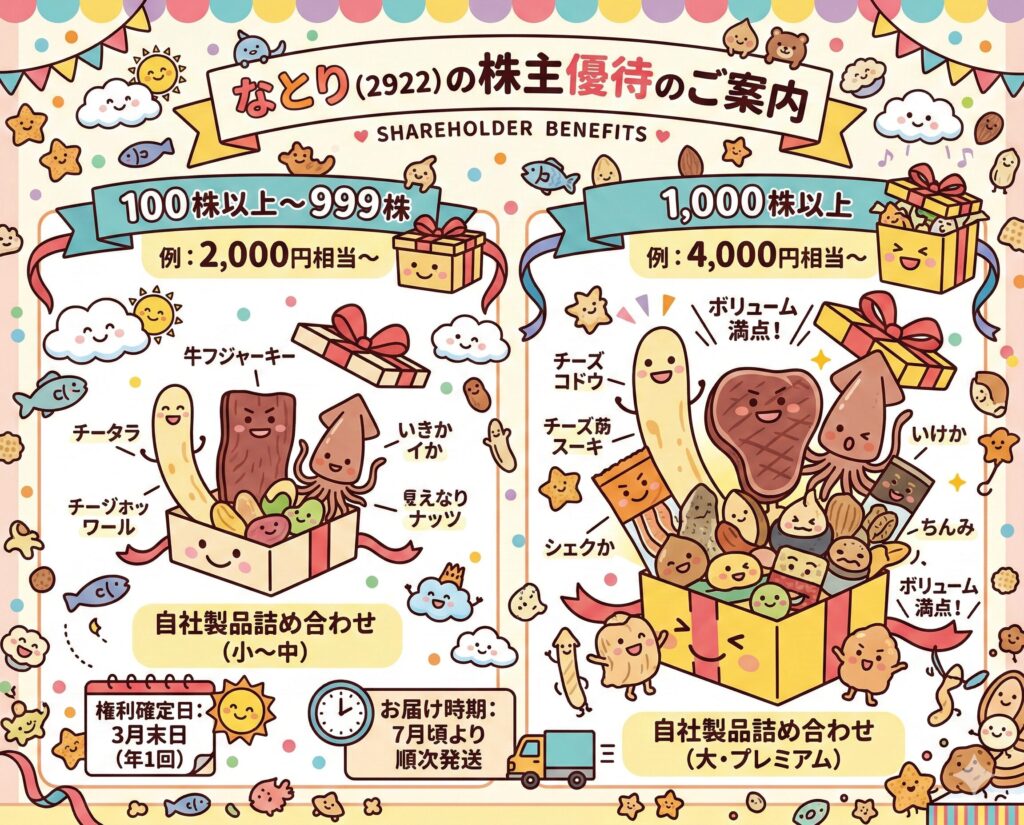なとりの株主優待は、自社製品(おつまみ・スナック)の豪華な詰め合わせです。2025年3月権利分から区分が新設され、より幅広い株主がメリットを享受できるようになっています。