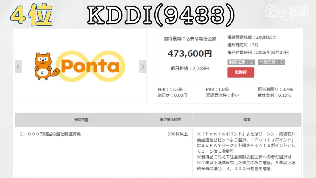 200株保有でポンタポイントが、2000円相当貰えるよ。