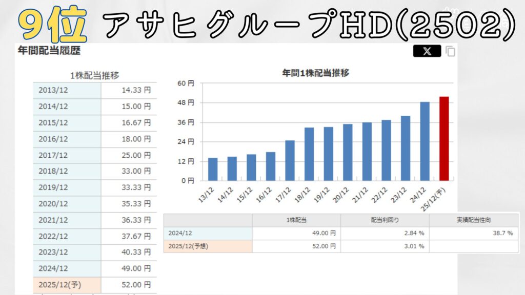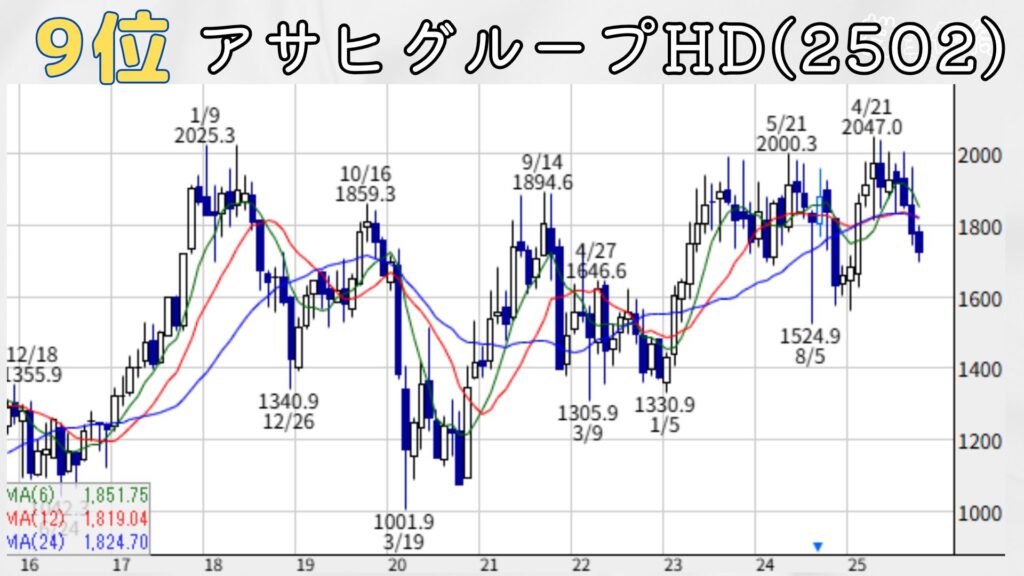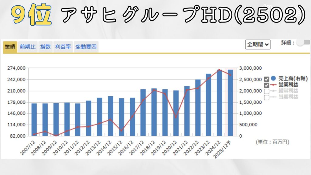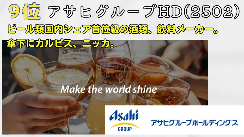 9位はアサヒグループホールディングス。