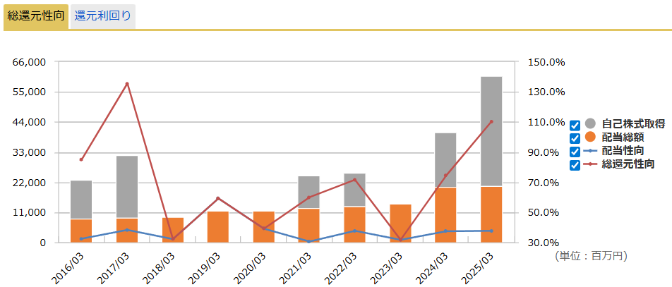 毎年、自社株買いを実施。総還元利回りは6.58%とかなり高め。