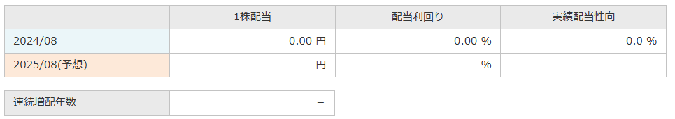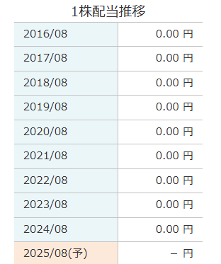 | 優待権利確定月 | 8月 | 配当利回り(予想) | 0% |