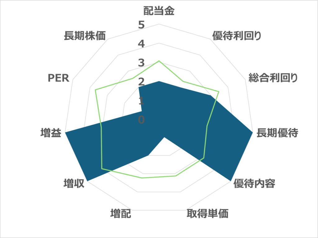 | 優待投資評価 | ★★★☆☆64pt | 1株配当(予想) | 0円 |
