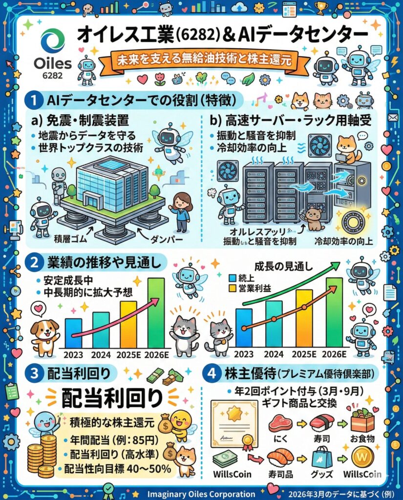 オイレス工業は、**「AIデータセンターという旬のテーマ」を持ちながら、「4%近い総合利回り」と「年2回の優待ポイント」**を楽しめる、非常にバランスの良い銘柄です。