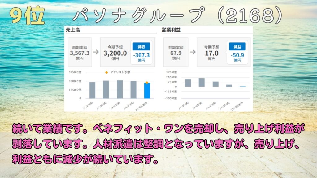 続いて業績です。ベネフィット・ワンを売却し、売り上げ利益が剥落しています。人材派遣は堅調となっていますが、売り上げ、利益ともに減少が続いています。