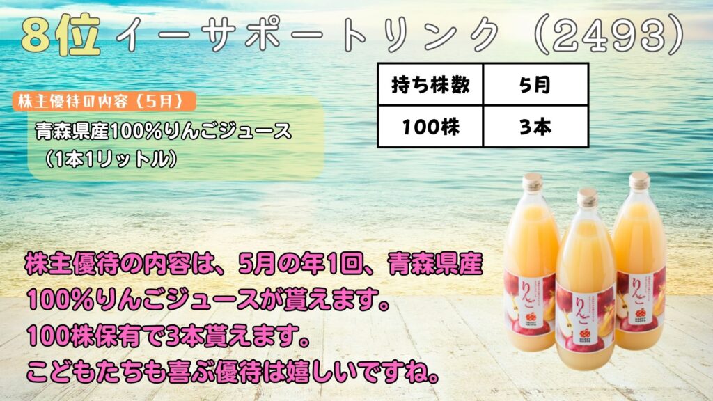 株主優待の内容は、5月の年1回、青森県産100%りんごジュースが貰えます。