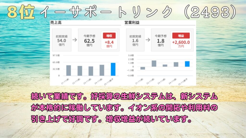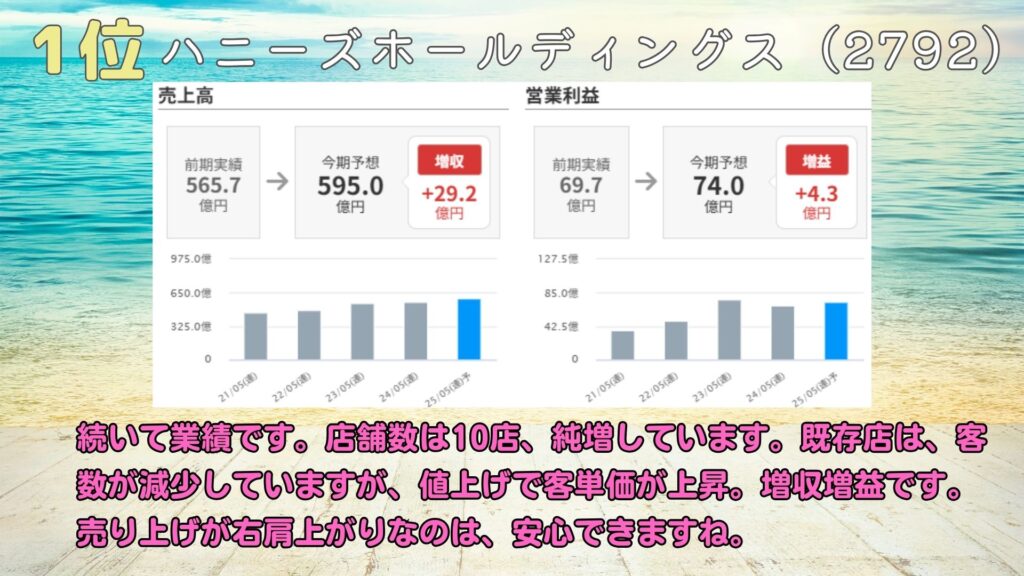 続いて業績です。店舗数は10店、純増しています。既存店は、客数が減少していますが、値上げで客単価が上昇。増収増益です。売り上げが右肩上がりなのは、安心できますね。