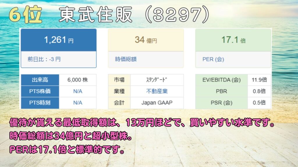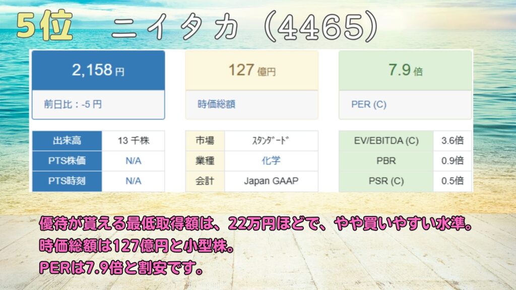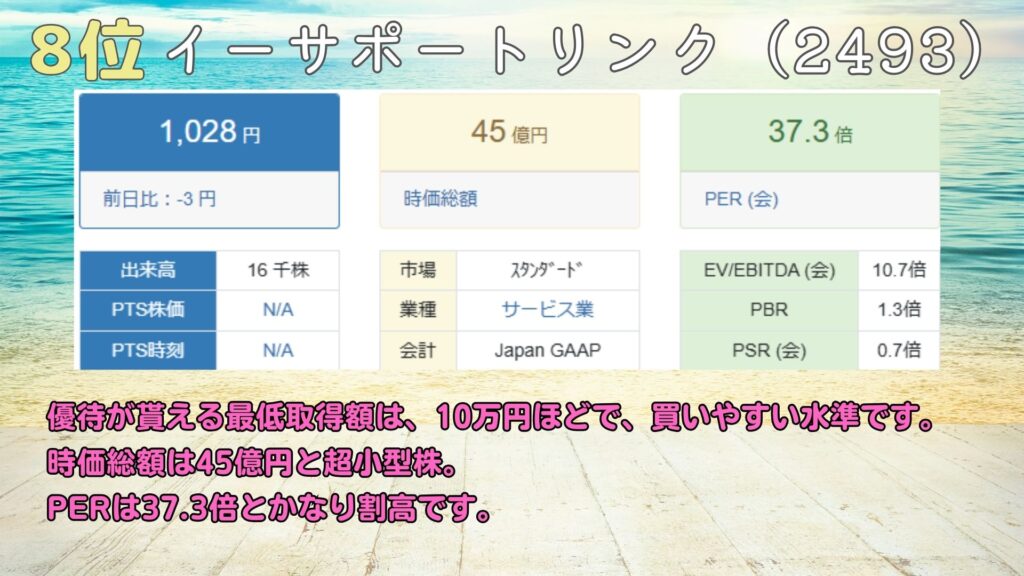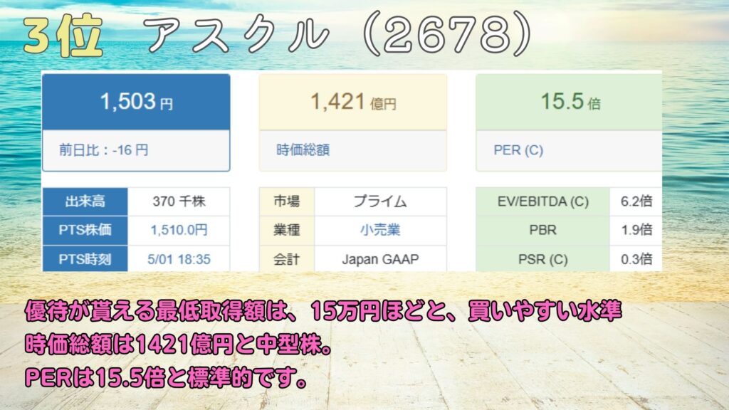 優待が貰える最低取得額は、22万円ほどで、やや買いやすい水準。