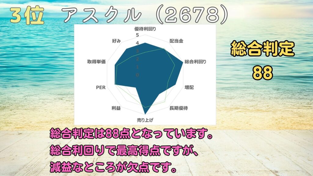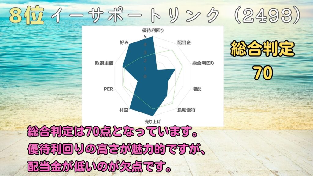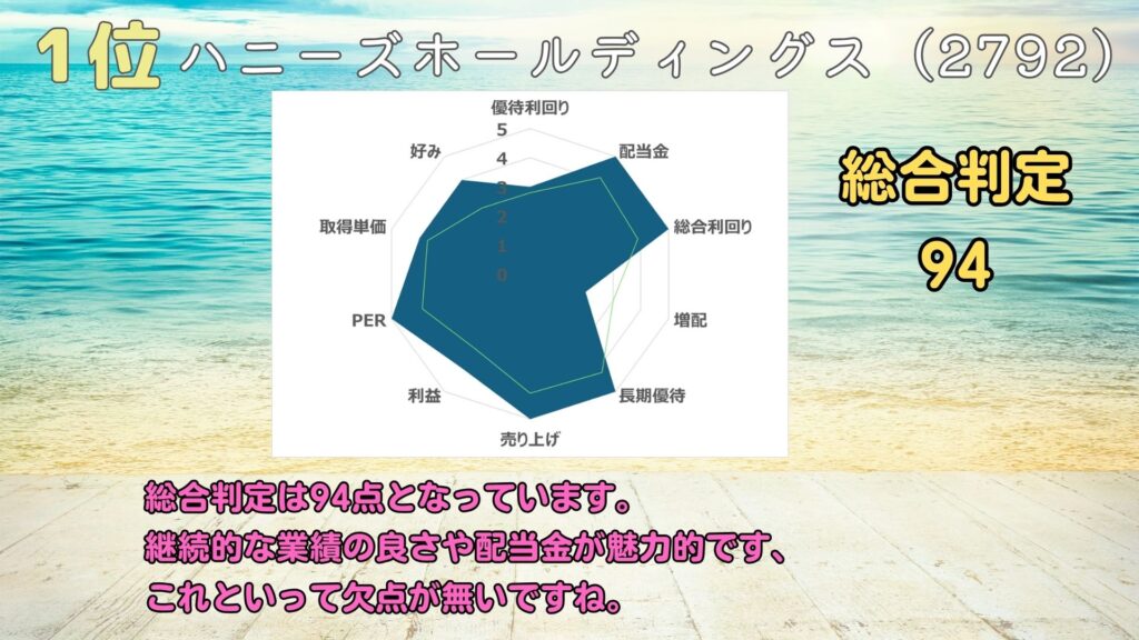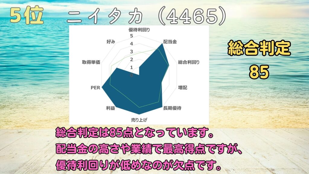 総合判定は85点となっています。5位ニイタカと同点ですが、総合利回りの高いほうを上位としています。