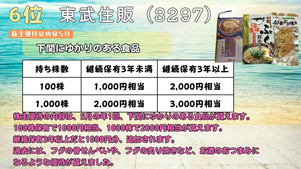 株主優待の内容は、5月の年1回、下関にゆかりのある食品が貰えます。