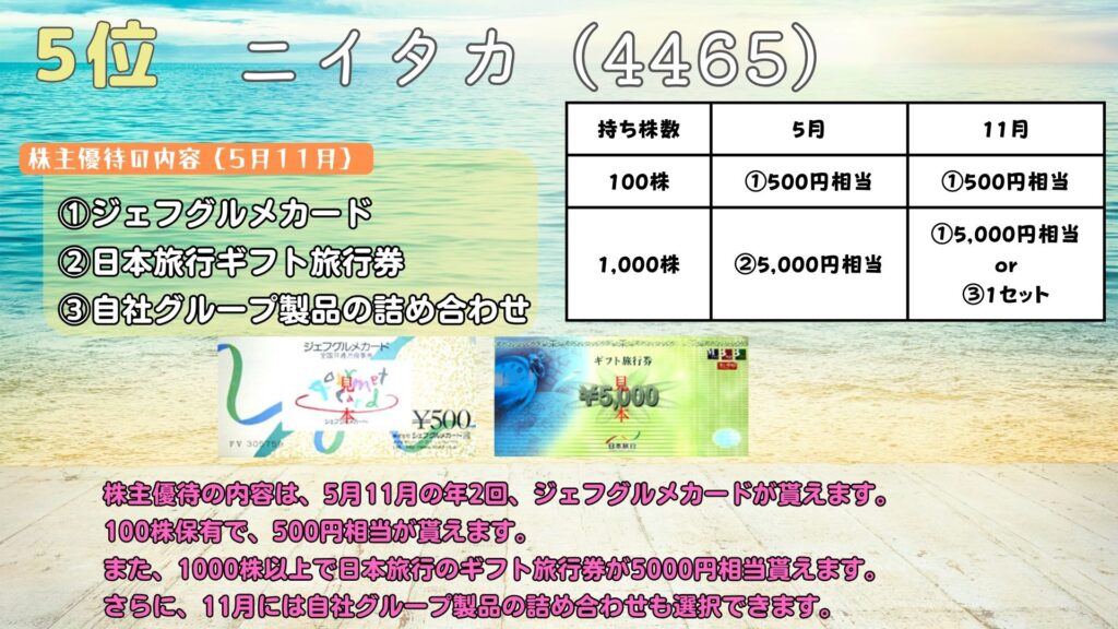 株主優待の内容は、5月11月の年2回、クオカードが貰えます。