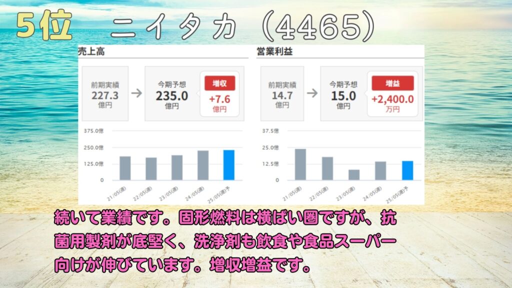 続いて業績です。固形燃料は横ばい圏ですが、抗菌用製剤が底堅く、洗浄剤も飲食や食品スーパー向けが伸びています。増収増益です。