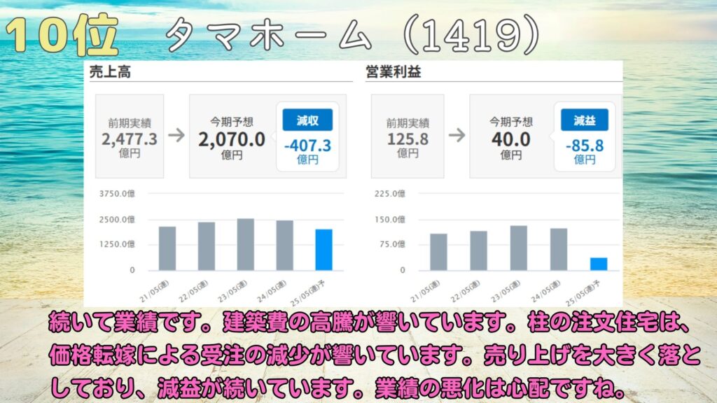 続いて業績です。建築費の高騰が響いています。柱の注文住宅は、価格転嫁による受注の減少が響いています。売り上げを大きく落としており、減益が続いています。業績の悪化は心配ですね。