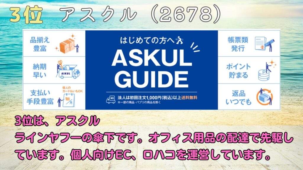 ラインヤフーの傘下です。オフィス用品の配達で先駆しています。個人向けEC、ロハコを運営しています。