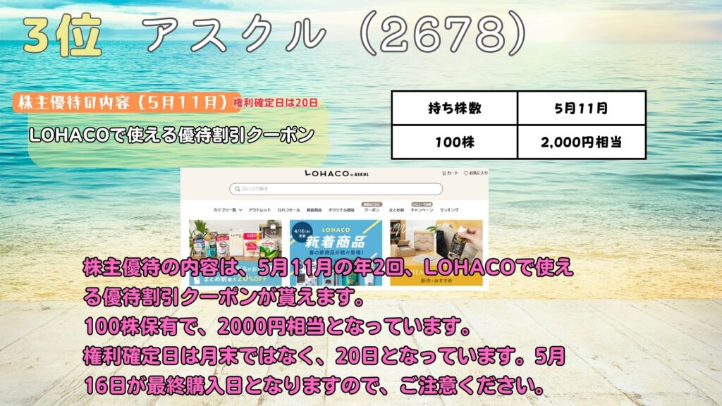 株主優待の内容は、5月11月の年2回、LOHACOで使える優待割引クーポンが貰えます。