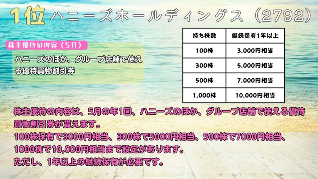 株主優待の内容は、5月の年1回、ハニーズのほか、グループ店舗で使える優待買物割引券が貰えます。